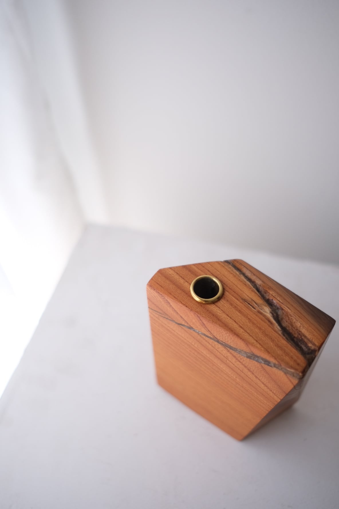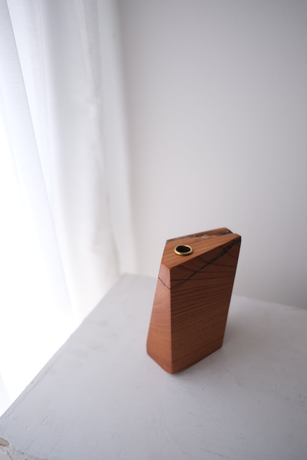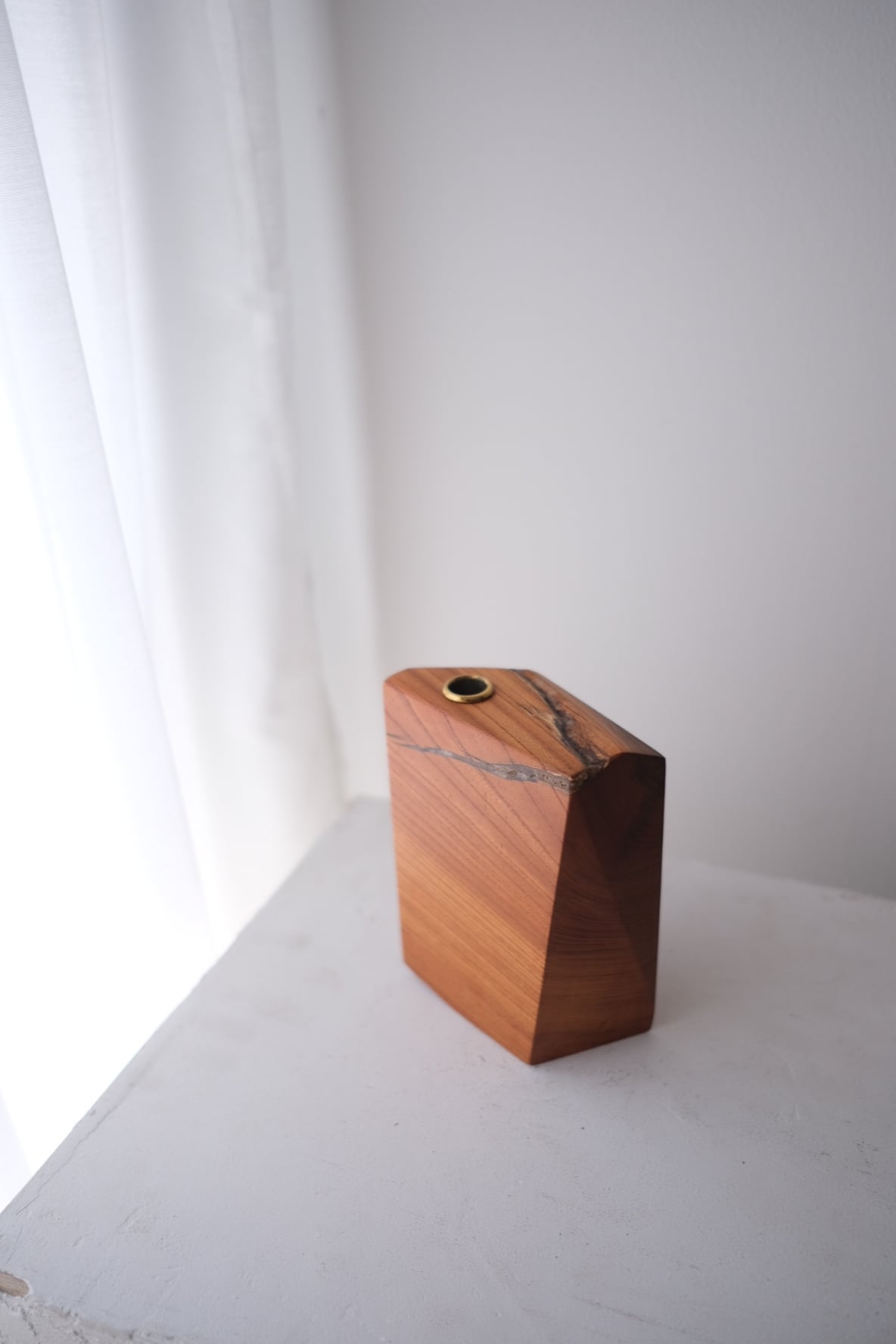 家具製作の過程で生まれた木片を、彫刻のように磨き上げ、一輪挿しに仕立てました。