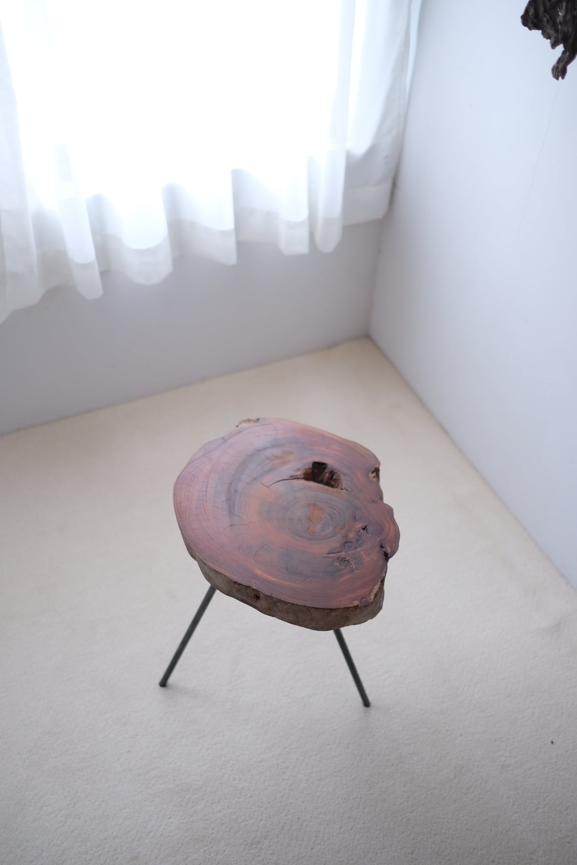三本の脚で立つ、一枚板のサイドテーブル。