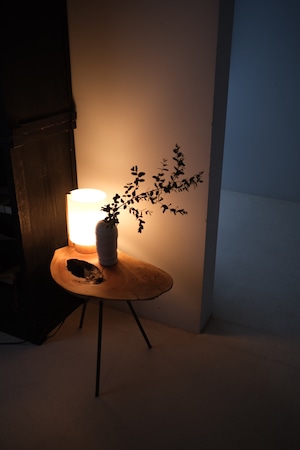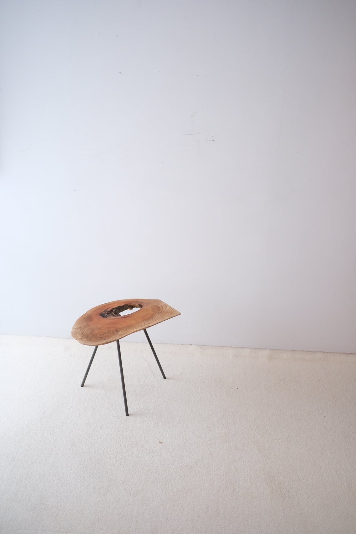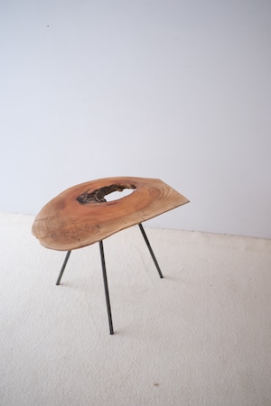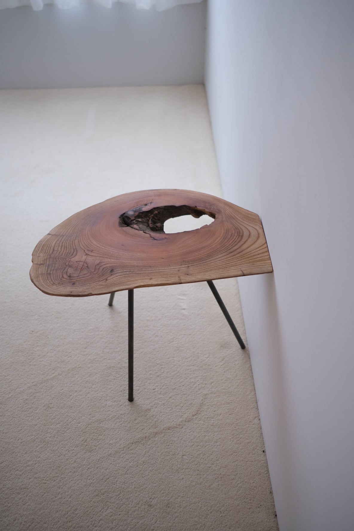 三本の脚で立つ、一枚板のサイドテーブル。