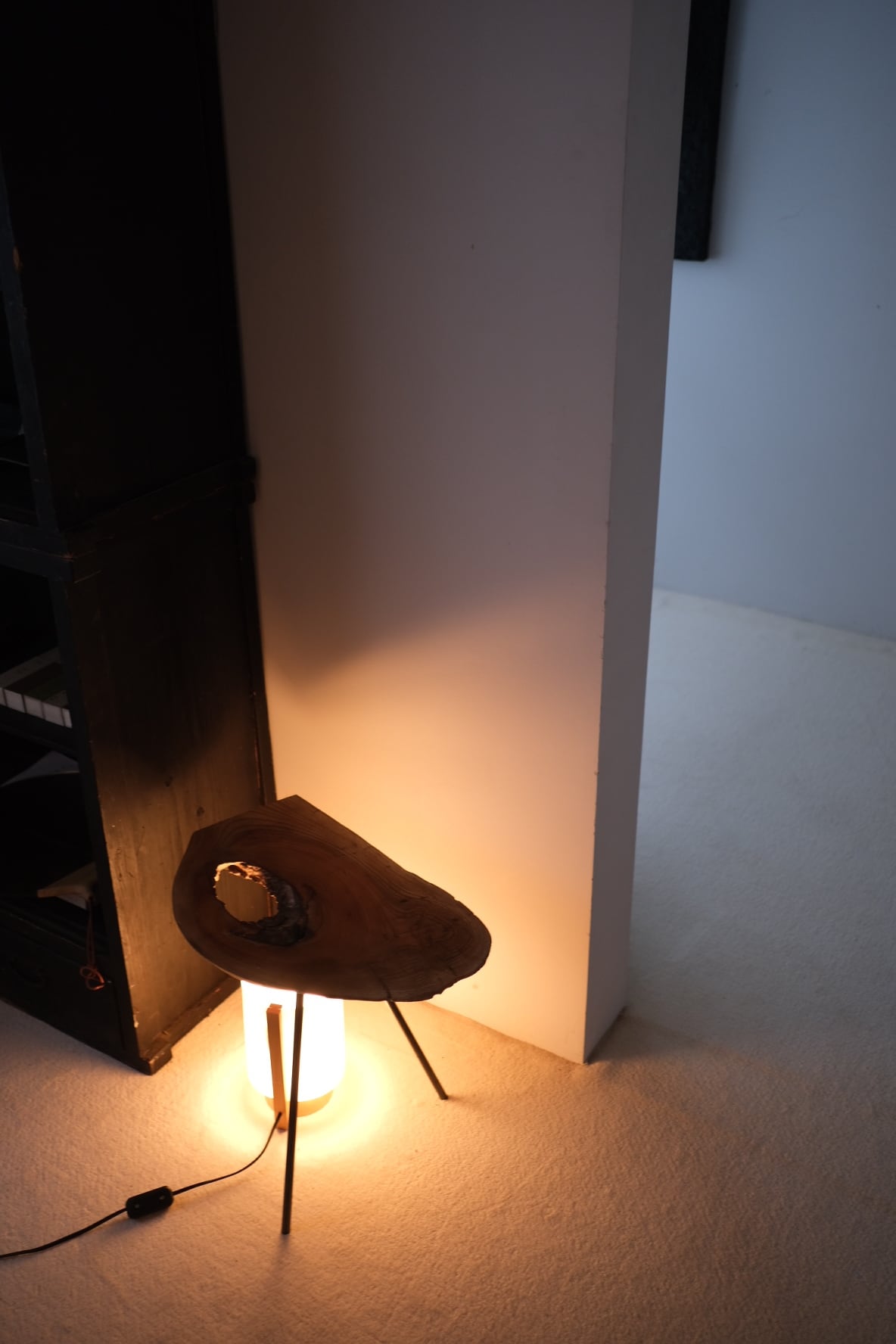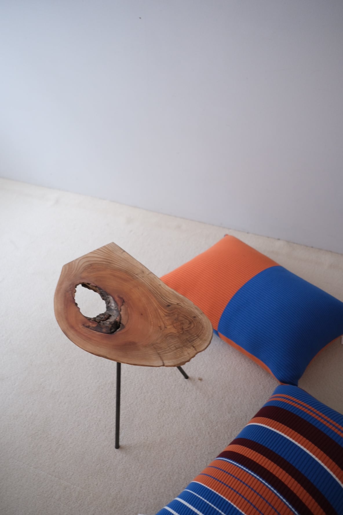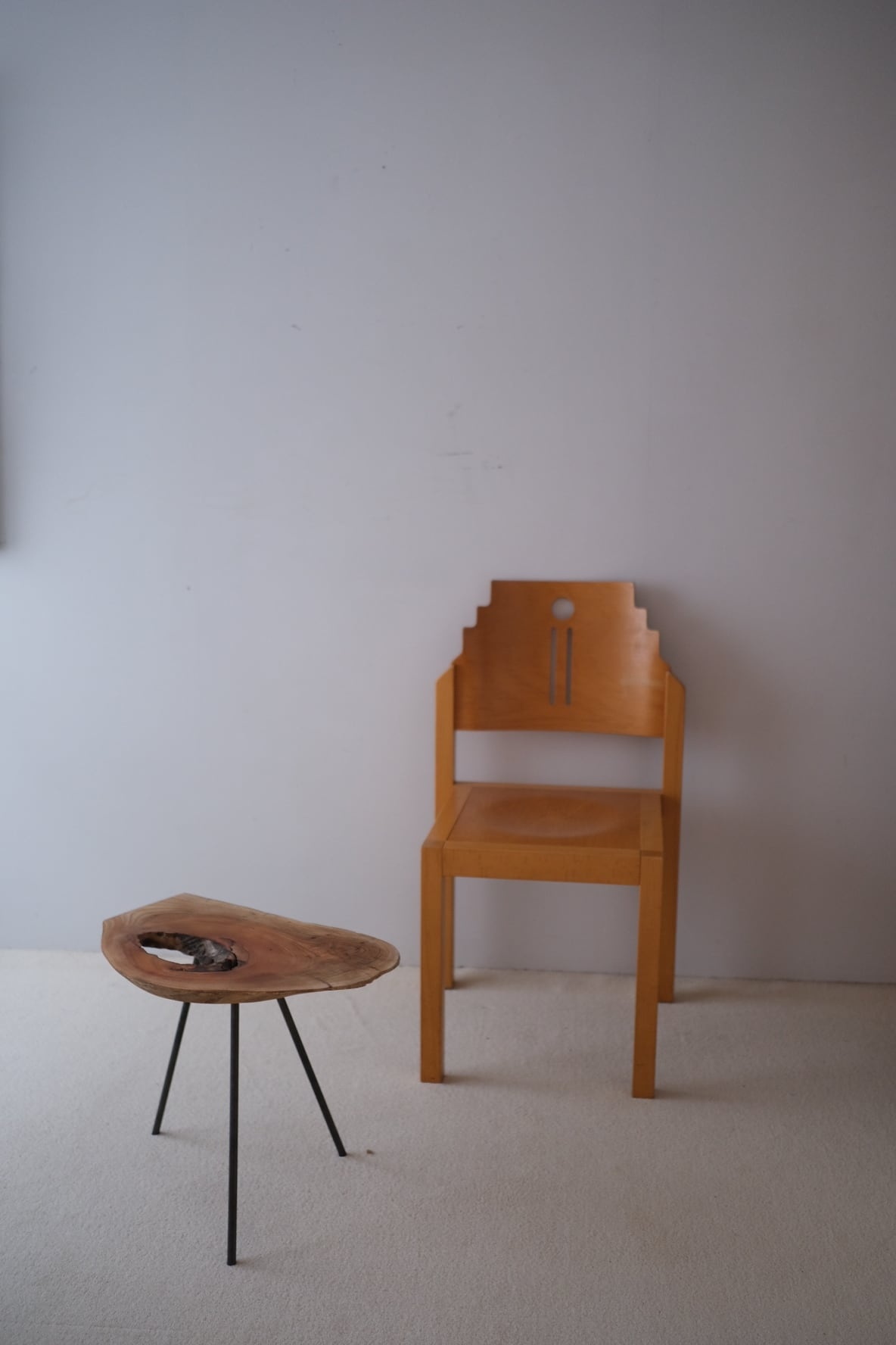 三本の脚で立つ、一枚板のサイドテーブル。