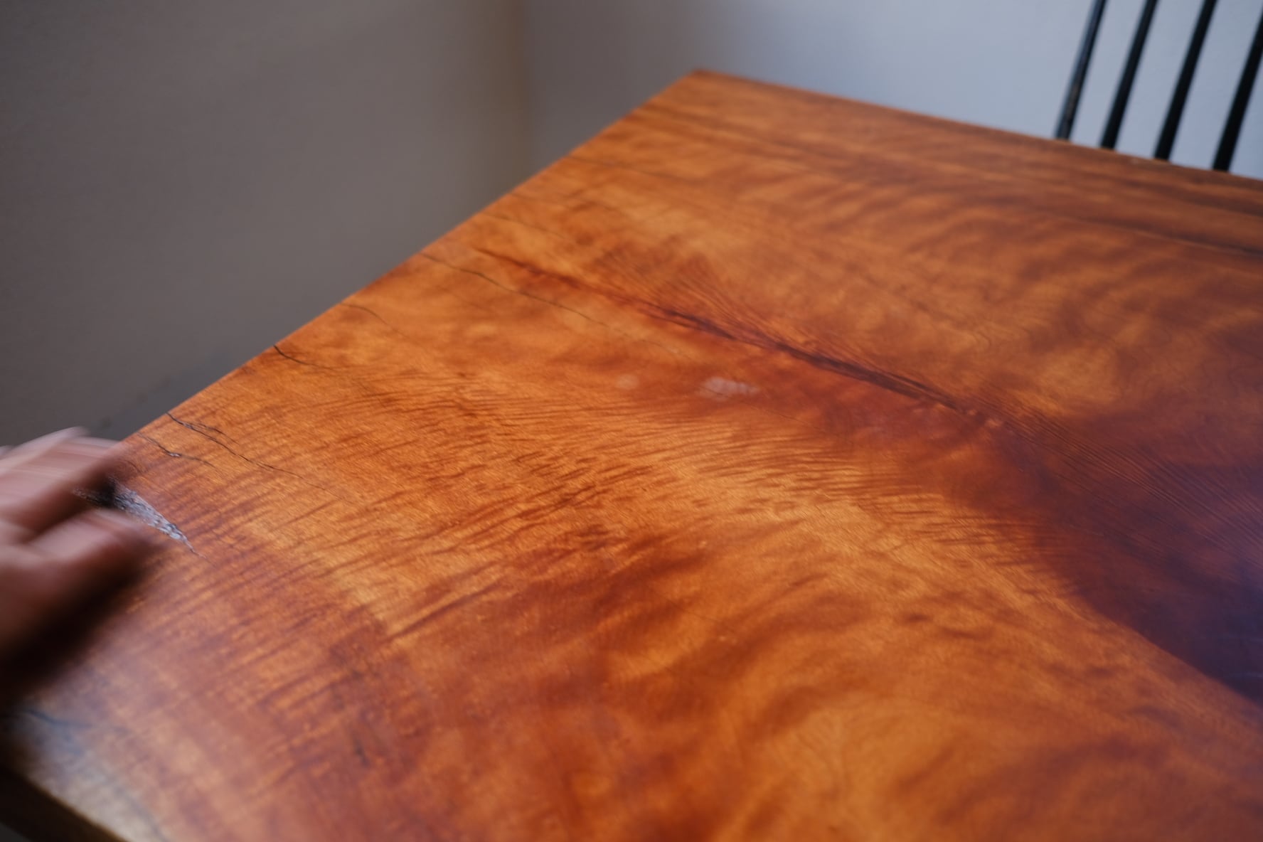 一枚板テーブルは、樹齢200年を超える天然木のみを使用し製作しております。自然乾燥に約10年~20年の歳月をかけ、職人の手によって、木の個性を最大限に引き出し、自然の雄大さを感じでいただけるよう製作しております。