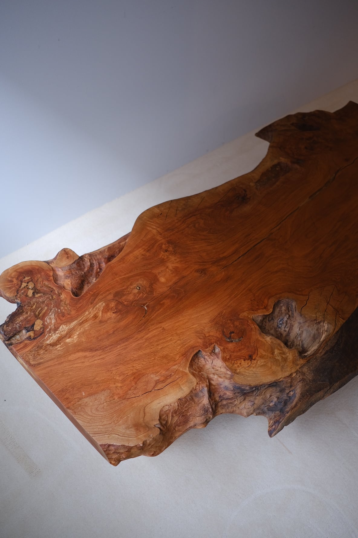 一枚板テーブルは、樹齢200年を超える天然木のみを使用し製作しております。自然乾燥に約10年~20年の歳月をかけ、職人の手によって、木の個性を最大限に引き出し、自然の雄大さを感じでいただけるよう製作しております。