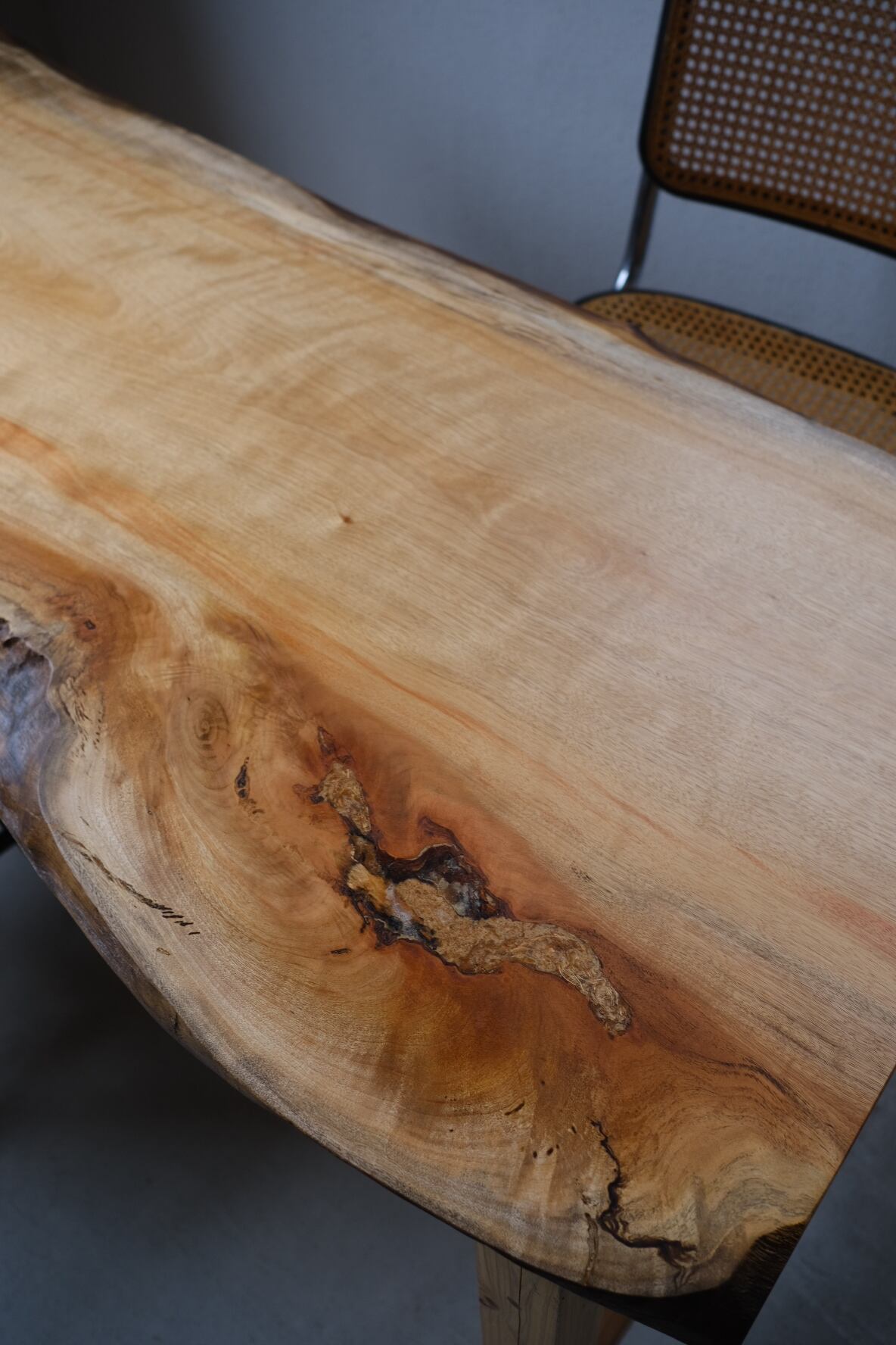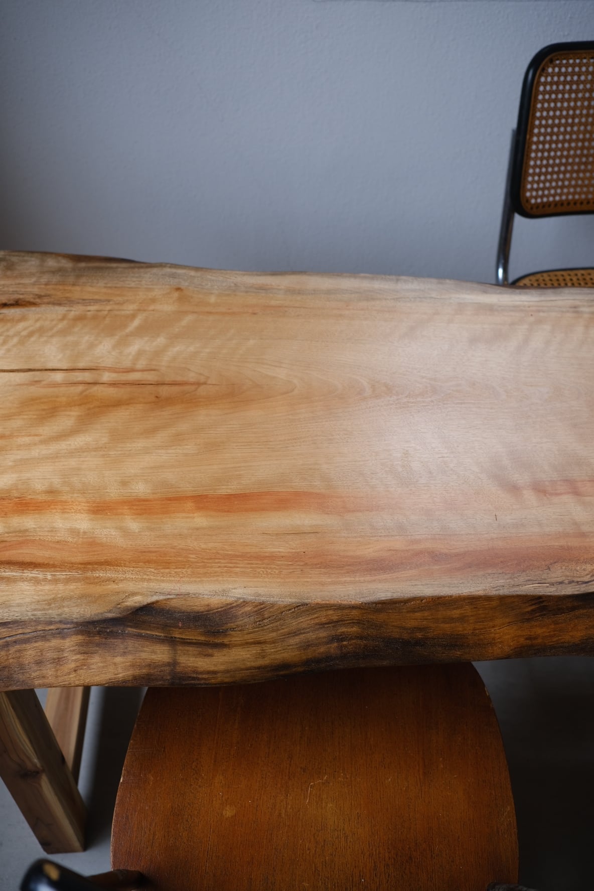 優しい杢目と光の当たり方でゆらゆらと動くような杢目が特徴的な椨のダイニングテーブルです。