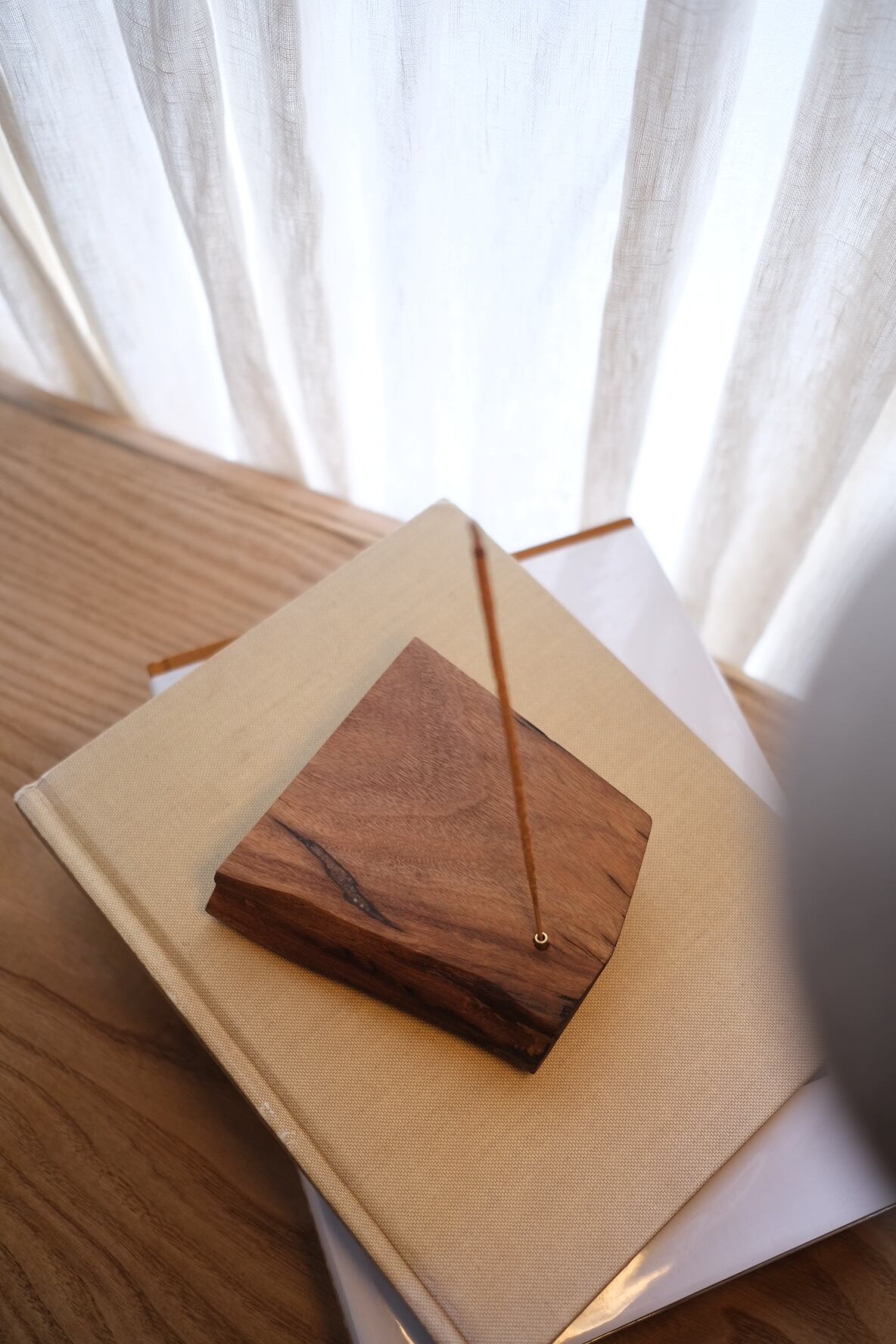 お香立ては、樹齢数百年の天然木を使用し、一枚板テーブルを製作する工程と同様に製作しています。